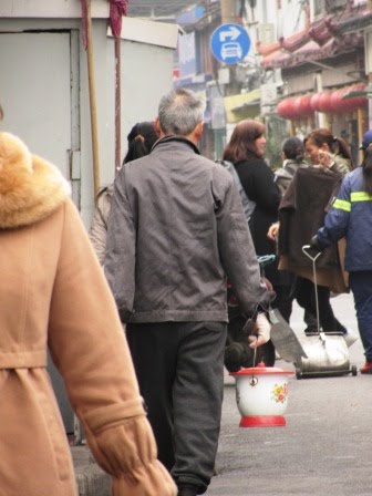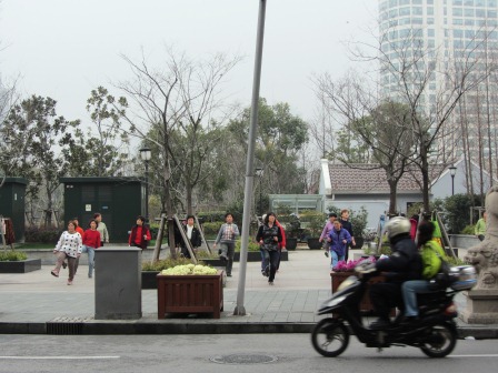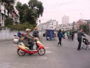 Look at the people in the foreground of the picture with their dogs in the basket of their bikes.  Janny said that this is one of the ways people take their dogs out for a walk in China.
