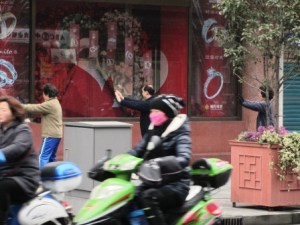 This is the more traditional tai chi, being done on the sidewalk with scooters racing by: