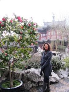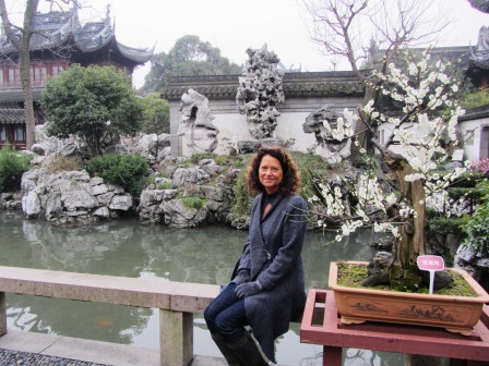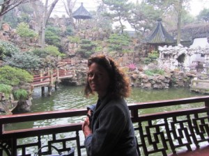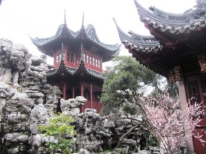 Inside Yu Garden, one of the traditional buildings facing the garden.  Note also that the trees are blossoming behind Krissie: