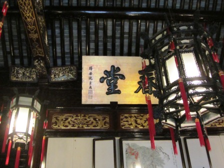 There are elaborate lanterns and ceiling decorations in the buildings: