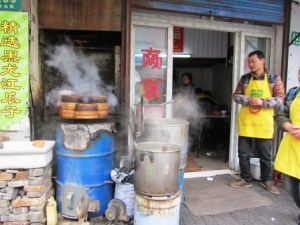 This is a local dumpling maker.  How would you like that job, filling up the dumpling containers?