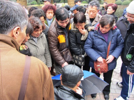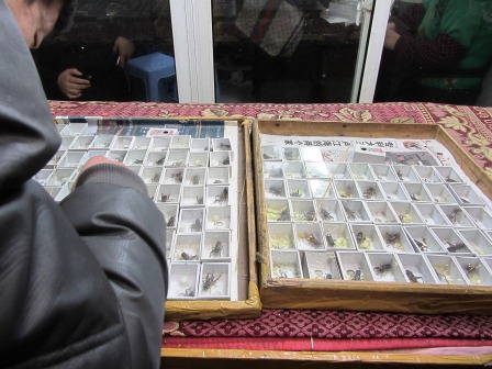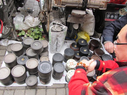 Here are the fighting crickets for sale.  No kidding.  They have cricket fights (looks more like cricket wrestling) and then bet on the matches.  The Chinese like to bet on just about anything, including cricket wrestling.  Janny said this guy was probably there all day examining the crickets to decide which one to buy as his fighter:
