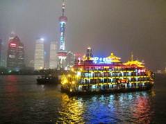We ate dinner on the port side of the ship, where we could see the Pudong (new Shanghai) skyline when a brightly colored ship went by: